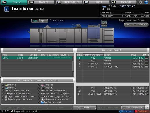 Repita los pasos 1 y 2. Es posible reservar hasta 100 tareas, incluidas las tareas de interrupción. Para confirmar/controlar los trabajos reservados, visualice la pantalla [Trabajo reservado] pulsando la ficha [TRABAJOS] y [Trab. reserv.].