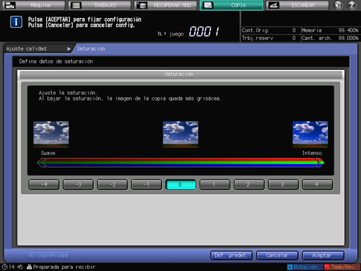 Se vuelve a la pantalla [COPIA]. La indicación [Saturación] puede encontrarse en [Ajuste calidad] en la pantalla [COPIA].