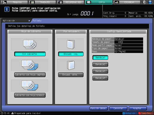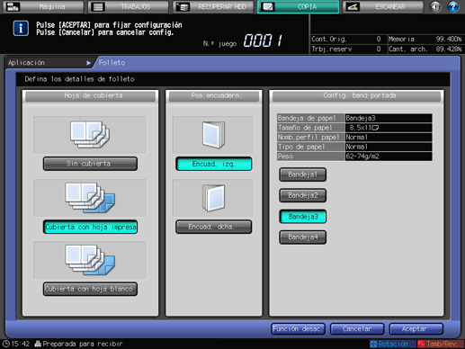 Si selecciona [Cubierta con hoja impresa] o [Cubierta con hoja blanco], pulse una de las teclas de bandeja que están debajo de [Config. band portada] para seleccionar la bandeja de papel cargada con portadas en el paso 2.