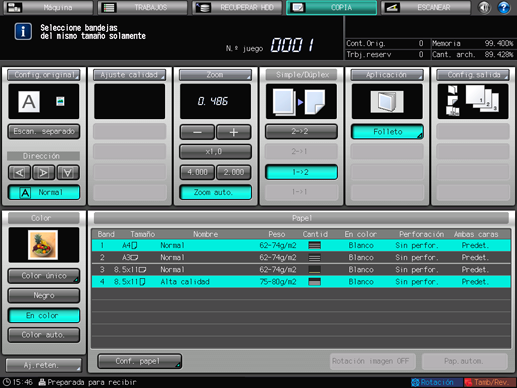 Las páginas del original deben ser múltiplo de 4 en modo [1->2] o múltiplo de 2 en modo [2->2]. En caso contrario, se insertan automáticamente páginas en blanco hasta el final.