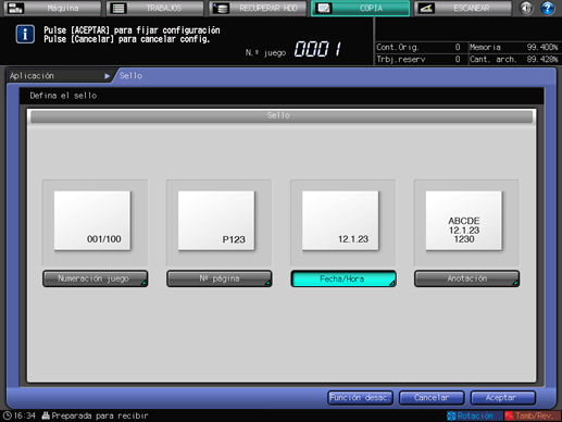 Para cancelar la función de Sello con la configuración actual guardada, pulse [Función desact.].