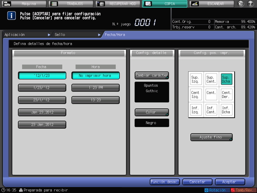 Especifique [Formato], [Config. detalle] ([Cambiar carácter], [Color]) y [Config. pos. impr.] para la fecha y hora.