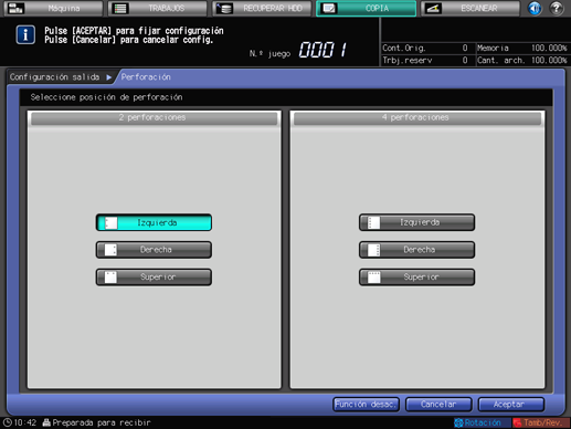 Para recuperar la configuración anterior, pulse [Cancelar]. Para cancelar la función Perforación con la configuración actual guardada, pulse [Función desac.]. Se vuelve a la pantalla [Configuración salida].