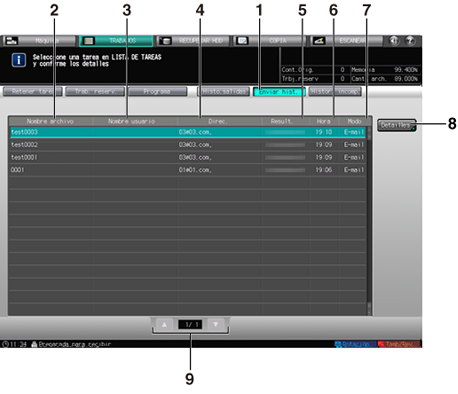 8 | [Detalles] | Se pulsa para comprobar los detalles de una tarea después de seleccionarla en la lista. Se muestra la pantalla [Detalles de ticket] de la tarea seleccionada. |