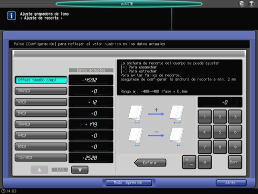 Permite ajustar el ancho de recorte establecido por la Grapadora en lomo SD‑506. El ancho de recorte debe ser superior a 2 mm; de lo contrario, es posible que la operación de recorte no pueda realizarse adecuadamente.