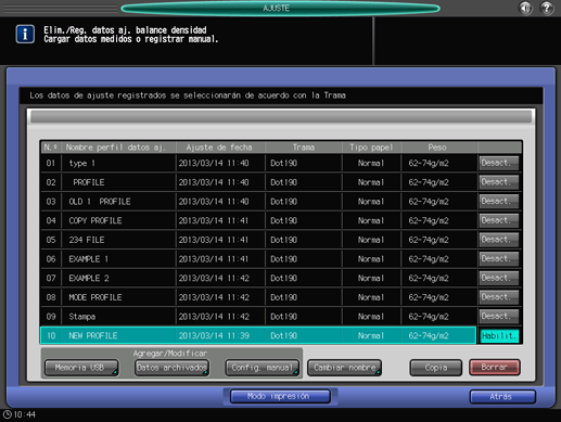 Si se han definido varios elementos de datos de ajuste para el mismo tipo de trama, tipo de papel y peso, marque [Activar] en el que desee. Los demás quedan automáticamente asignados a la opción [Desactivar].