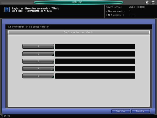 [Conf. asunto corr.electr.] | Permite registrar hasta 5 asuntos de correo electrónico. También puede editar asuntos registrados. |