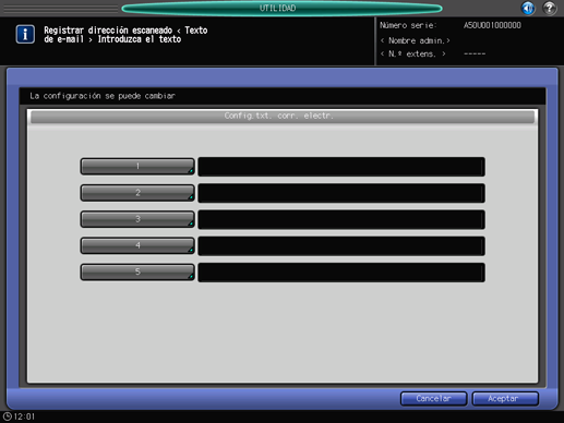 [Config.txt. corr. electr.] | Permite registrar hasta 5 textos de correo electrónico. También puede editar textos registrados. |