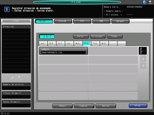 Siga el procedimiento descrito en Dirección envío escaneado para visualizar la pantalla de [Menú Dirección envío escaner].