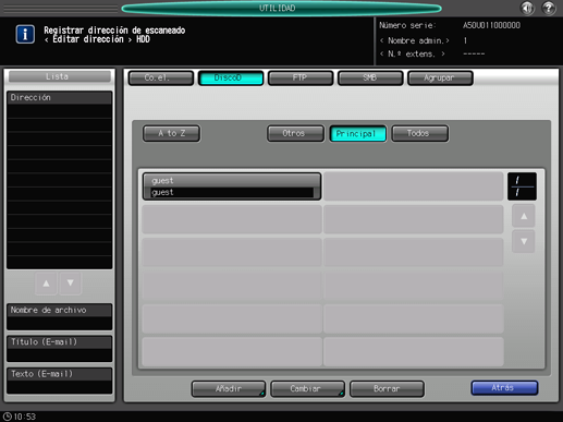 1. Siga el procedimiento descrito en Dirección envío escaneado para visualizar la pantalla de [Menú Dirección envío escaneado].