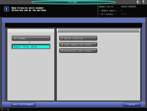 1. Siga el procedimiento descrito en Dirección envío escaneado para visualizar la pantalla de [Menú Dirección envío escaneado].