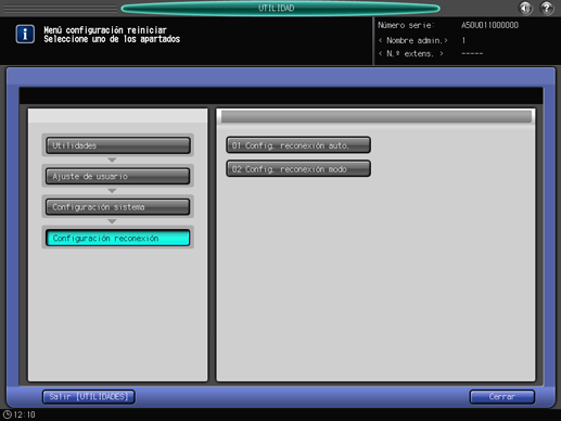 Pulse [Configuración sistema] en la pantalla [Menú Configuración de usuario] y, a continuación, pulse [Configuración reconexión] y [Config. reconexión auto.] de forma consecutiva.