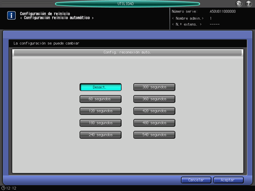 Esta función permite reiniciar las condiciones de copia y recuperar la pantalla predeterminada cuando transcurre un cierto periodo de tiempo sin que se pulse ningún botón en el panel táctil o en el panel de control.