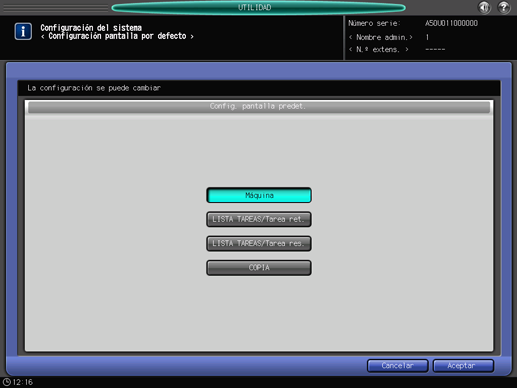Para anular el cambio, pulse [Cancelar]. En ambos casos, la pantalla vuelve a [Menú configuración sistema].