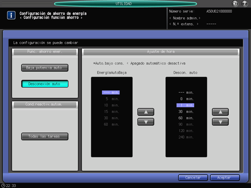 ] que aparecen debajo de [Desconexión auto] a la derecha de la pantalla para seleccionar el periodo de tiempo que desee.