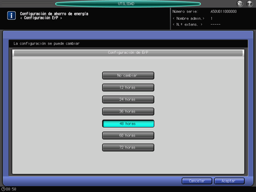 Para anular el cambio, pulse [Cancelar]. En ambos casos, la pantalla vuelve a [Menú Configuración de ahorro de energía].