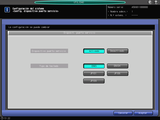 Especifique si se debe usar un dispositivo de puerto de servicio (puerto USB). Seleccione además el tipo de teclado si va a utilizar el dispositivo de puerto de servicio.