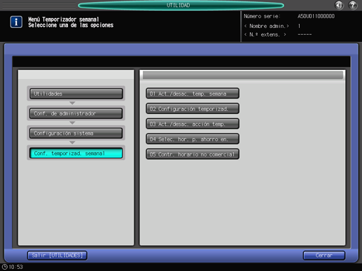 Pulse [Configuración sistema] en la pantalla [Menú Configuración administrador máquina] y, a continuación, pulse [Conf. temporizad. semanal] y [Act./desac. acción temp.] de forma consecutiva.