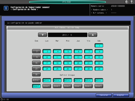 Establezca el encendido y apagado del equipo para días determinados del mes. En este caso, la máquina se encenderá y apagará en esos días siguiendo la configuración realizada mediante la función Configuración de hora. Configure el encendido y apagado del equipo para cada día por separado o colectivamente de lunes a domingo para todo el mes.