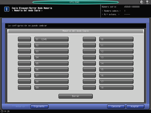 Pulse [Configuración sistema] en la pantalla [Menú Configuración administrador máquina] y, a continuación, pulse [Definir prohib. operación], [Bloq./borrar memoria modo] y [Memoria del modo Copia] de forma consecutiva.
