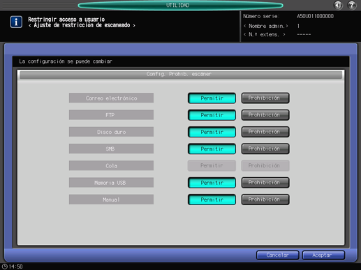 Pulse [Configuración sistema], [Definir prohib. operación] y [Config. Prohib. escáner] de forma consecutiva.