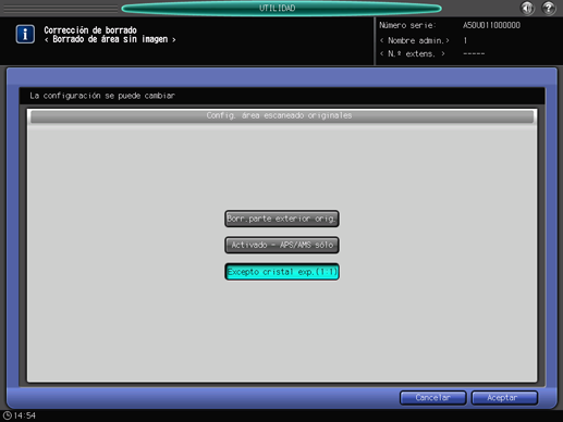 [Excepto cristal exp.(1:1)]: borra el área exterior, excepto al realizar una copia que tiene el mismo tamaño que el original escaneado en el cristal de originales.