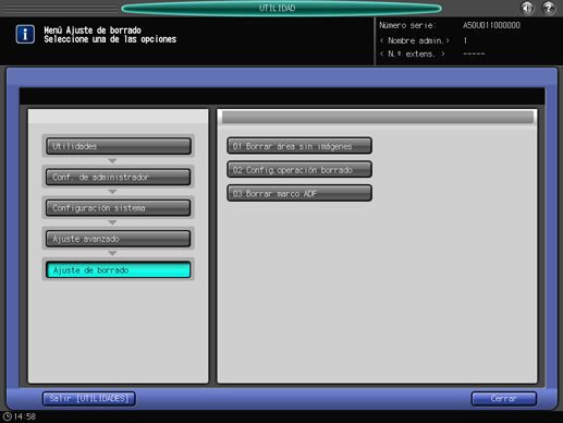 Pulse [Configuración sistema] en la pantalla [Menú Configuración administrador máquina] y, a continuación, pulse [Ajuste avanzado], [Ajuste de borrado] y [Config.operación borrado] de forma consecutiva.