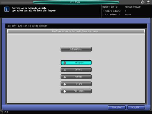 Defina la densidad de original que se debe utilizar cuando se seleccione la función de borrado de área sin imagen. Es posible definir la densidad de original automáticamente. El valor predeterminado es [Automático].