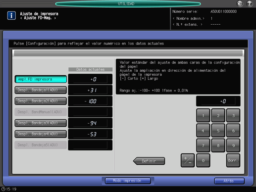 Esta operación es la misma que la operación a la que se accede siguiendo esta ruta: [Ajuste] - [Ajuste máquina] - [Ajuste de impresora] - [Aj.ampl.dir.alimentación] desde la pantalla [Máquina].