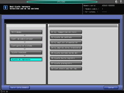 Pulse [Configuración sistema] en la pantalla [Menú Configuración administrador máquina] y, a continuación, pulse [Ajuste avanzado], [Ajuste de impresora] y [Ajuste bucle registro] de forma consecutiva.