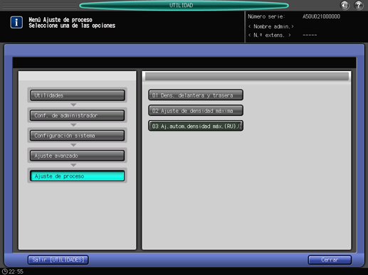 Pulse [Configuración sistema] en la pantalla [Menú Configuración administrador máquina] y, a continuación, pulse [Ajuste avanzado], [Ajuste de proceso] y [Aj.autom.densidad máx.(RU)] de forma consecutiva.