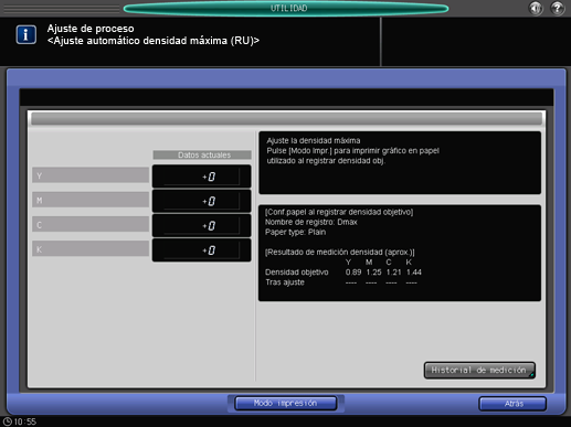 El resultado del ajuste automático se muestra en [Datos actuales]. Estos valores se ven reflejados en Ajuste de densidad máxima: ajuste de la densidad máxima de Y, M, C y K.