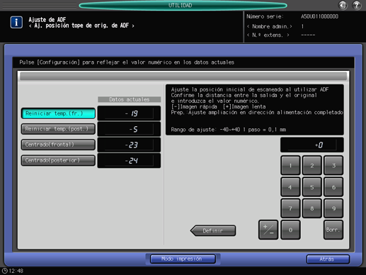 Inicio Configuración y ajustesAj. pos. límite original ADF: Ajuste de la posición de inicio de escaneado de originales en el ADF y la posición de imagen en dirección transversal