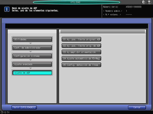 Pulse [Configuración sistema] en la pantalla [Menú Configuración administrador máquina] y, a continuación, pulse [Ajuste avanzado], [Ajuste de ADF] y [Aj. pos. límite orig. de ADF] de forma consecutiva.