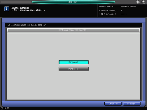 Pulse [Configuración sistema] en la pantalla [Menú Configuración administrador máquina] y, a continuación, pulse [Ajuste avanzado] y [Áng.grap.esq.(atrás)] de forma consecutiva.