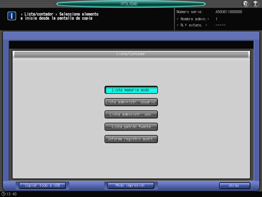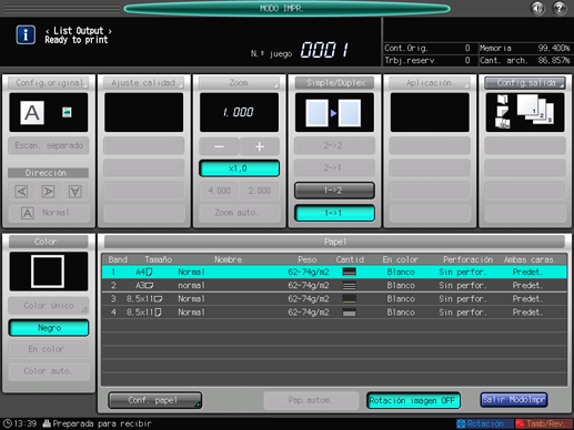 Cuando termine la impresión, pulse [Salir ModoImpr] para volver a la pantalla [Lista/Contador].