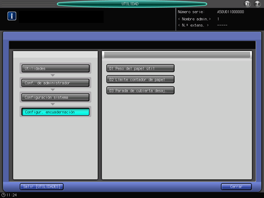 Pulse [Configuración sistema] en la pantalla [Menú Configuración administrador máquina] y, a continuación, pulse [Configur. encuadernación] y [Peso del papel útil] de forma consecutiva.