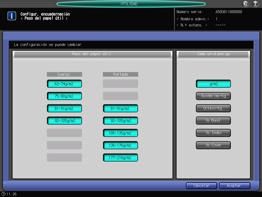 Si alguno de los pesos del papel seleccionados aquí no se especifica en la bandeja que se va a utilizar para el encuadernador, la operación de encuadernado no estará disponible y se mostrará el mensaje "no adecuado".