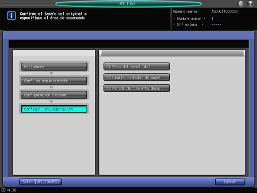 Pulse [Configuración sistema] en la pantalla [Menú Configuración administrador máquina] y, a continuación, pulse [Configur. encuadernación] y [Límite contador de papel] de forma consecutiva.