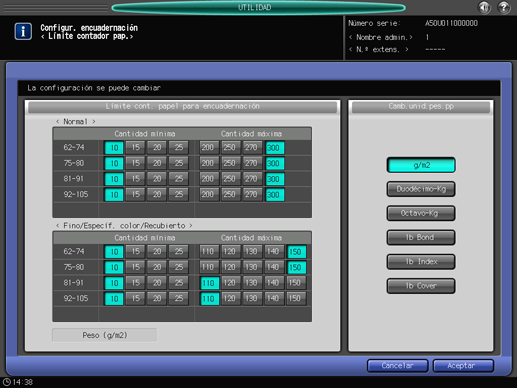 Especifique el número máximo y mínimo de hojas que será posible encuadernar como un juego para cada peso de papel.