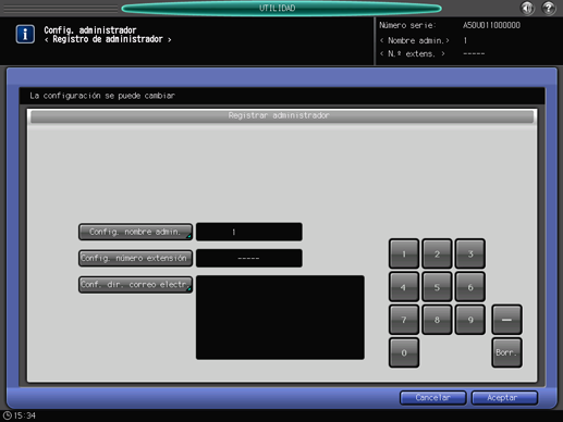 Registre el nombre del administrador y el número de extensión que se van a visualizar en la esquina derecha superior de la pantalla [UTILIDAD]. Grabe también el correo electrónico del administrador.