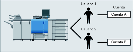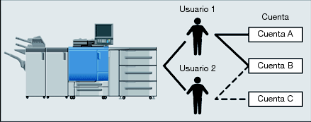 Esta configuración del sistema es adecuada para realizar un seguimiento de usos múltiples de la máquina distribuidos a cada grupo de proyecto cuando la comparten varios empleados. Con esta configuración, la máquina le permite mantener las estadísticas de cada empleado (cada usuario) y en cada grupo de proyecto (cada cuenta). Al mantener las estadísticas por grupos (por cuentas), dos empleados diferentes (usuario 1 y usuario 2) se contabilizarán como parte de mismo grupo o departamento.