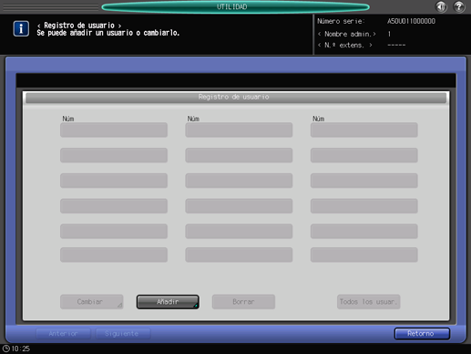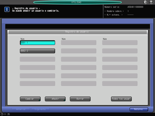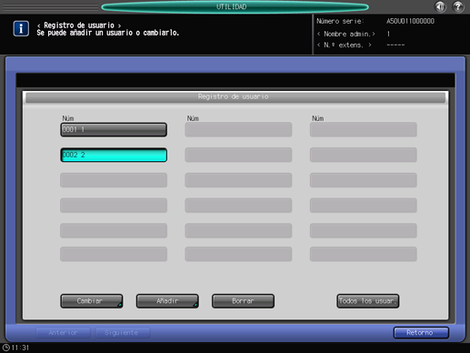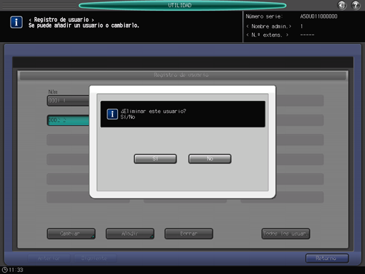 Pulse [Sí] para confirmar el cambio y volver a la pantalla [Registro de usuario]. Si pulsa [No], vuelve a la pantalla [Cambiar todos los usuarios]. Para volver a la pantalla [Registro de usuario] pulse [Cancelar].