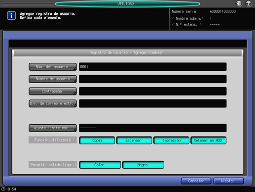 Utilice esta función para asignar un número a cada usuario y definir Nombre de usuario, Contraseña, Dirección de correo electrónico, Nombre de cuenta, Ajuste de límite máx., Función utilizable, Registro de tarjeta IC y Permisos de salida en [Color]/[Negro] para cada número de usuario.
