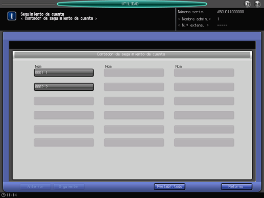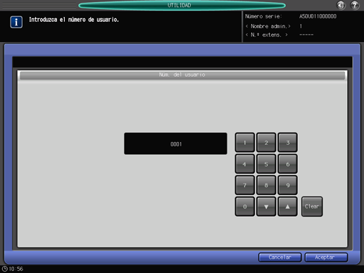 Utilice el teclado del panel táctil para introducir el número que desee. Es posible definir un número utilizando caracteres numéricos, dentro del intervalo de 1 hasta el límite superior que es el valor introducido en Número distribución usuario.
