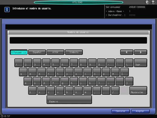 Pulse [Nombre de usuario] para visualizar la pantalla [Config. nombre de usuario]. Introduzca el nombre de usuario deseado. Puede introducir hasta 64 caracteres de un byte (32 caracteres de dos bytes) para el nombre del usuario. Para obtener más información sobre cómo introducir caracteres, consulte Introducción de caracteres.