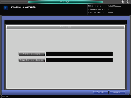 Pulse [Contraseña] para visualizar la pantalla [Configuración de contraseña]. Pulse [Contraseña nueva] para visualizar la pantalla [Introducir nueva contraseña]. Escriba una contraseña y pulse [Aceptar]. Pulse [Comprobar introducción] para visualizar la pantalla [Comprobar introducción]. Escriba la misma contraseña y pulse [Aceptar]. Puede introducir hasta 64 caracteres de un byte para la contraseña de usuario. Para obtener más información sobre cómo introducir caracteres, consulte Introducción de caracteres.