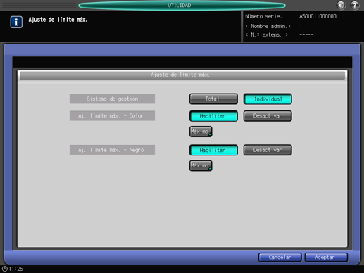 Pulse [Ajuste de límite máx.] para visualizar la pantalla [Ajuste de límite máx.]. Especifique las funciones que van a estar disponibles para el usuario autenticado. Al seleccionar [Individual] en [Sistema de gestión] se activa la posibilidad de especificar un contador de límite separado para color y negro. Para introducir el límite del contador deseado, seleccione [Habilitar] y, a continuación, pulse [Máximo].