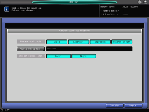 Cambie los parámetros de Función utilizable, Ajuste límite máx. y Permisos de Salida para todos los usuarios al mismo tiempo.