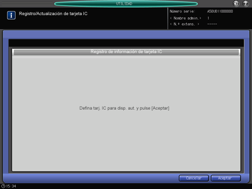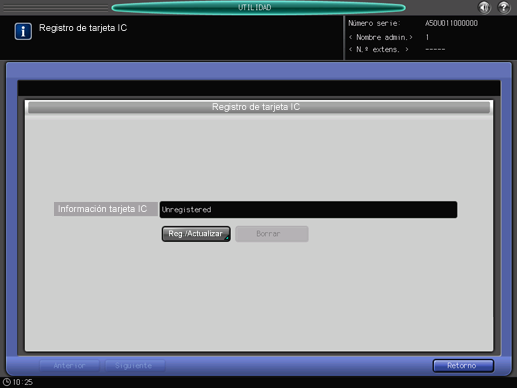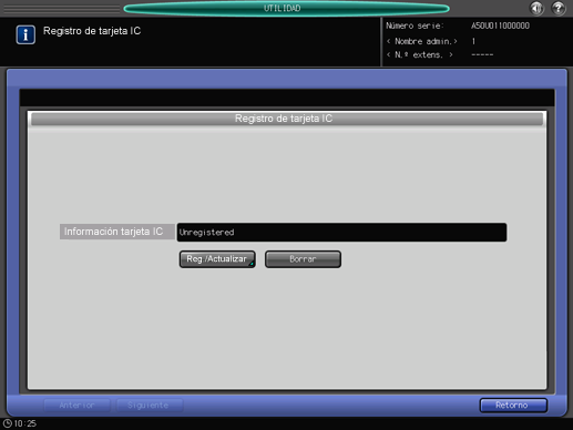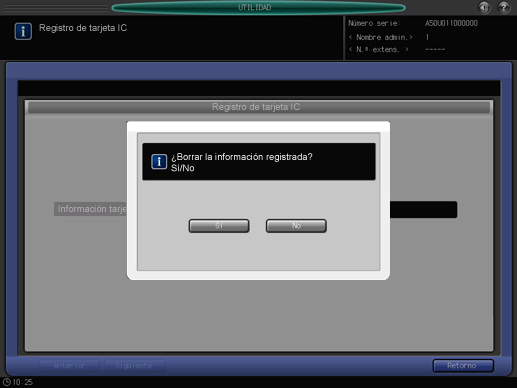 Para borrar la información registrada de la tarjeta IC, pulse [Borrar]. Se visualiza un diálogo de confirmación. Pulse [Aceptar] para borrar la información anterior y restaurar la opción [Unregistered] a la derecha de [Información tarjeta IC].